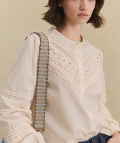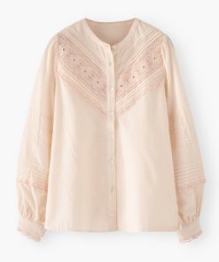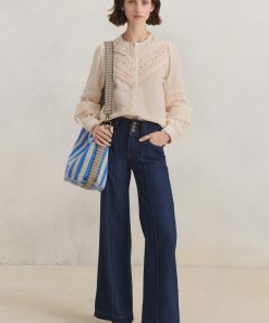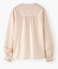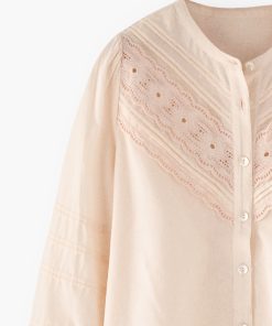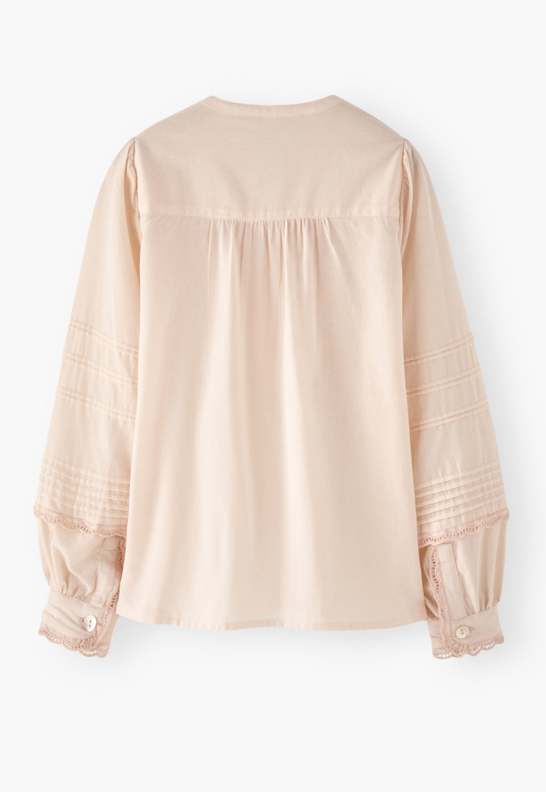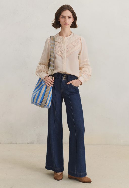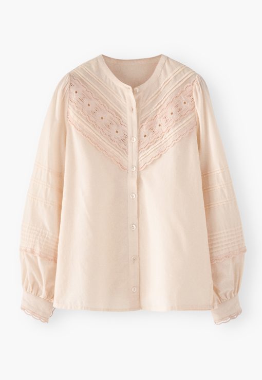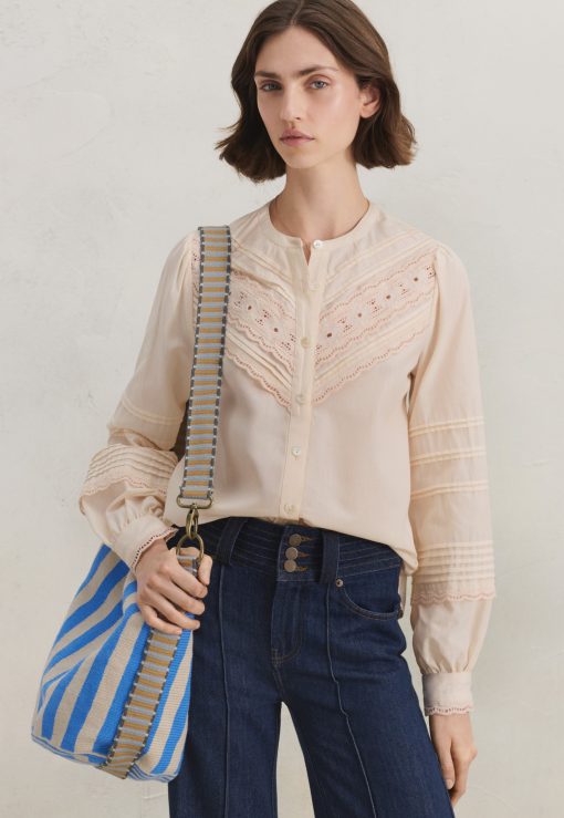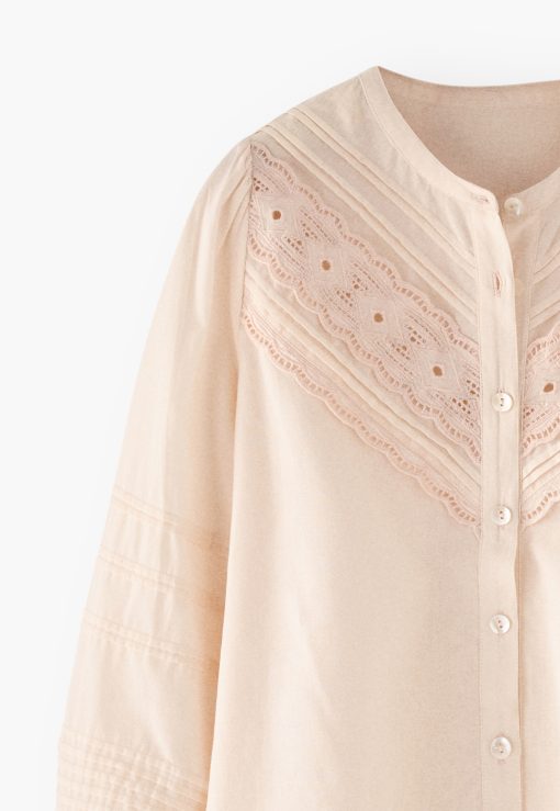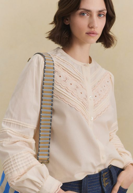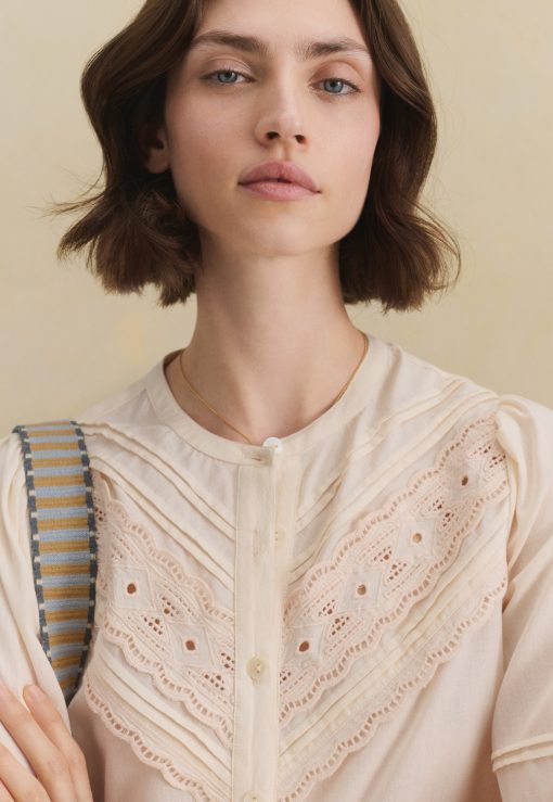 A Wrap London signature piece, this soft, chambray cotton blouse is beautifully detailed with pintucks and lace at the blouson sleeves and chevroned pintucks and cutwork lace at the front. An easy way to add a touch of glamour to the every day.