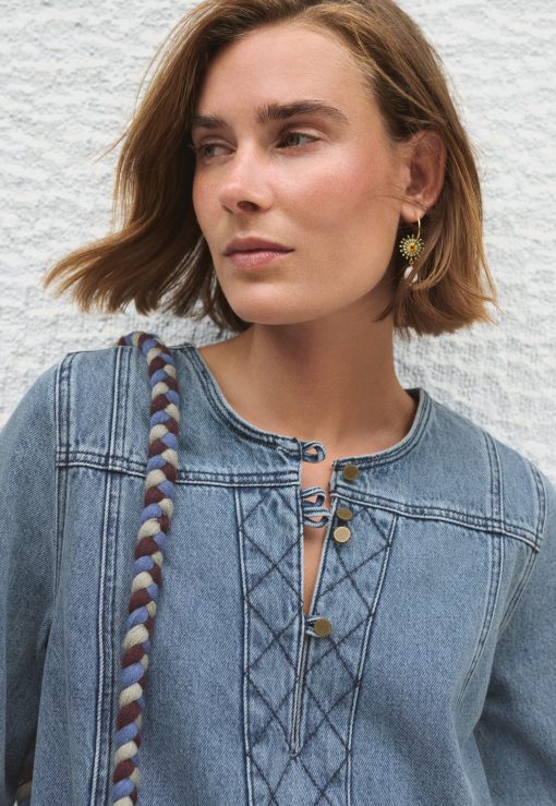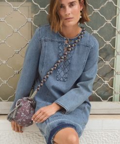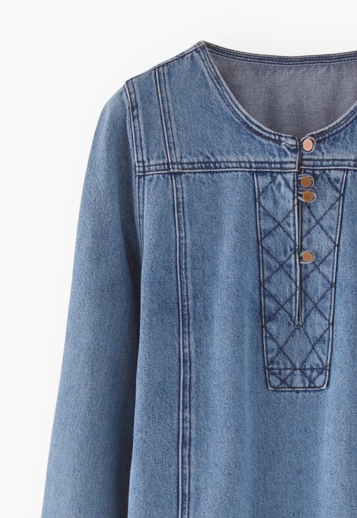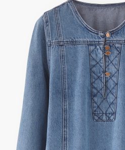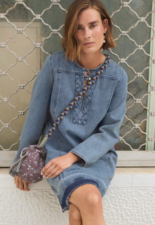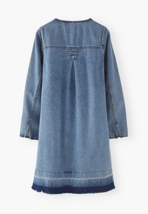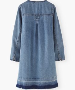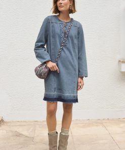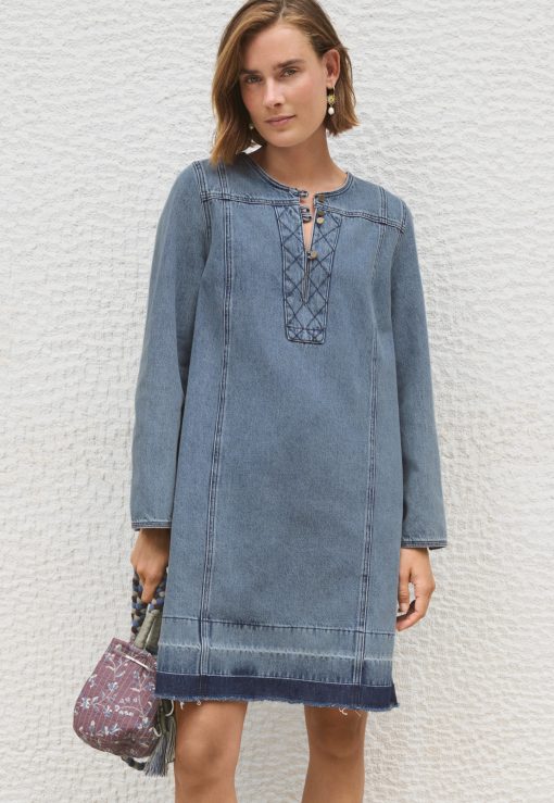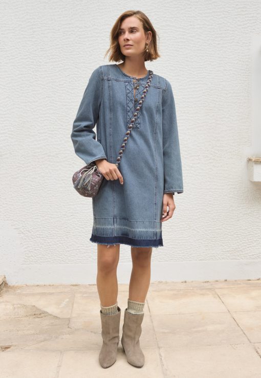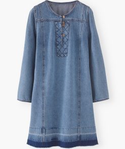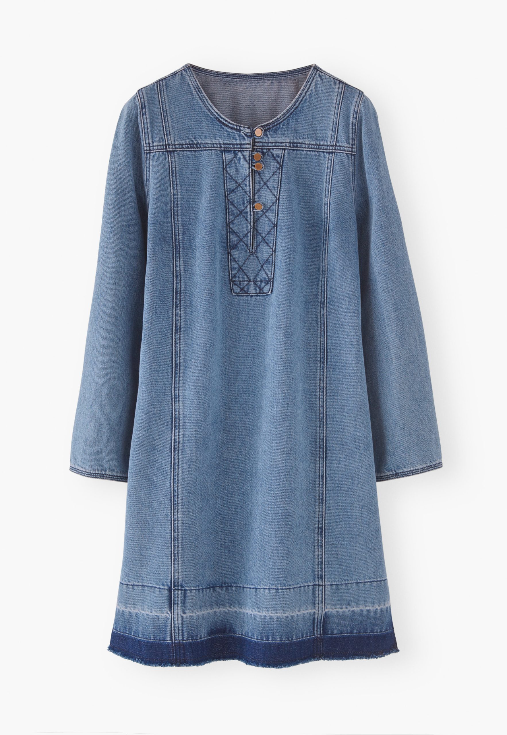 A great casual dress in lightweight, washed denim with contrast-coloured stitch details. Designed to look like a much-loved favourite with a let-down hem detail and a raw edge finish. With full-length sleeves and essential side-pockets.
