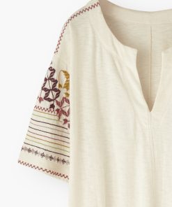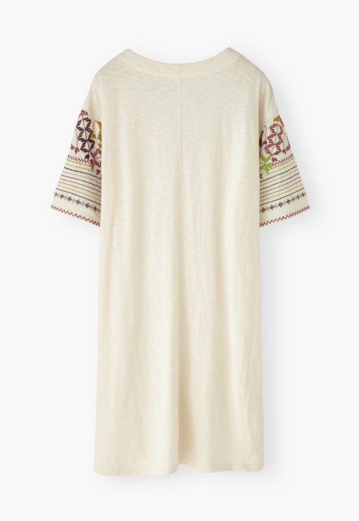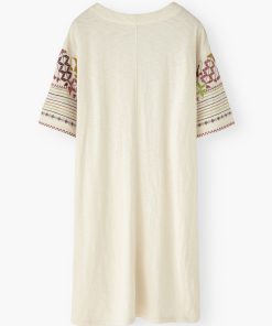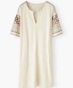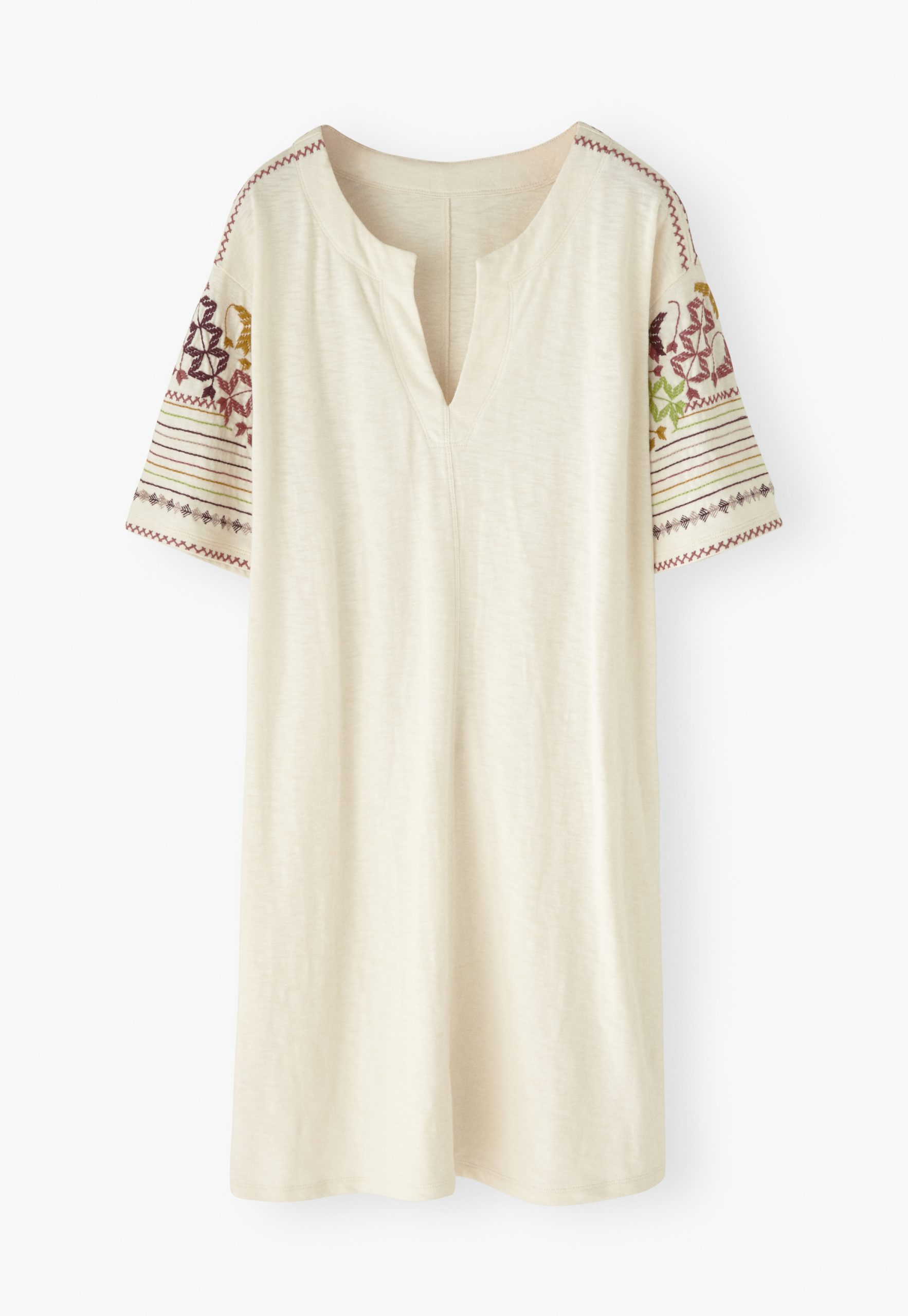 A great beach-cover up, this pure cotton shift dress has contrasting embroidery on the sleeves and seams. Easy dropped shoulders and a notched neckline complete with always-useful pockets.