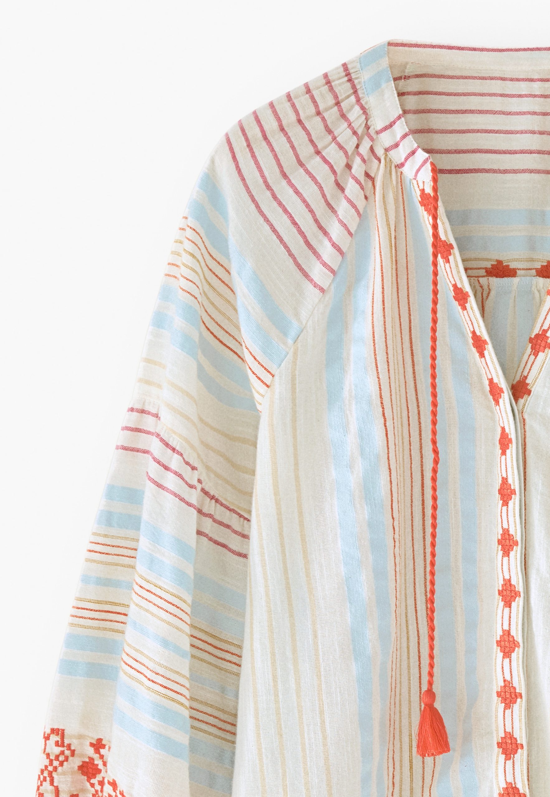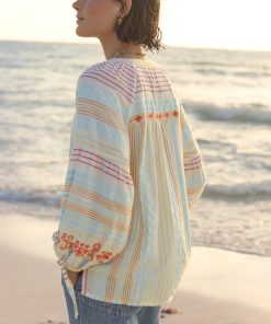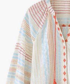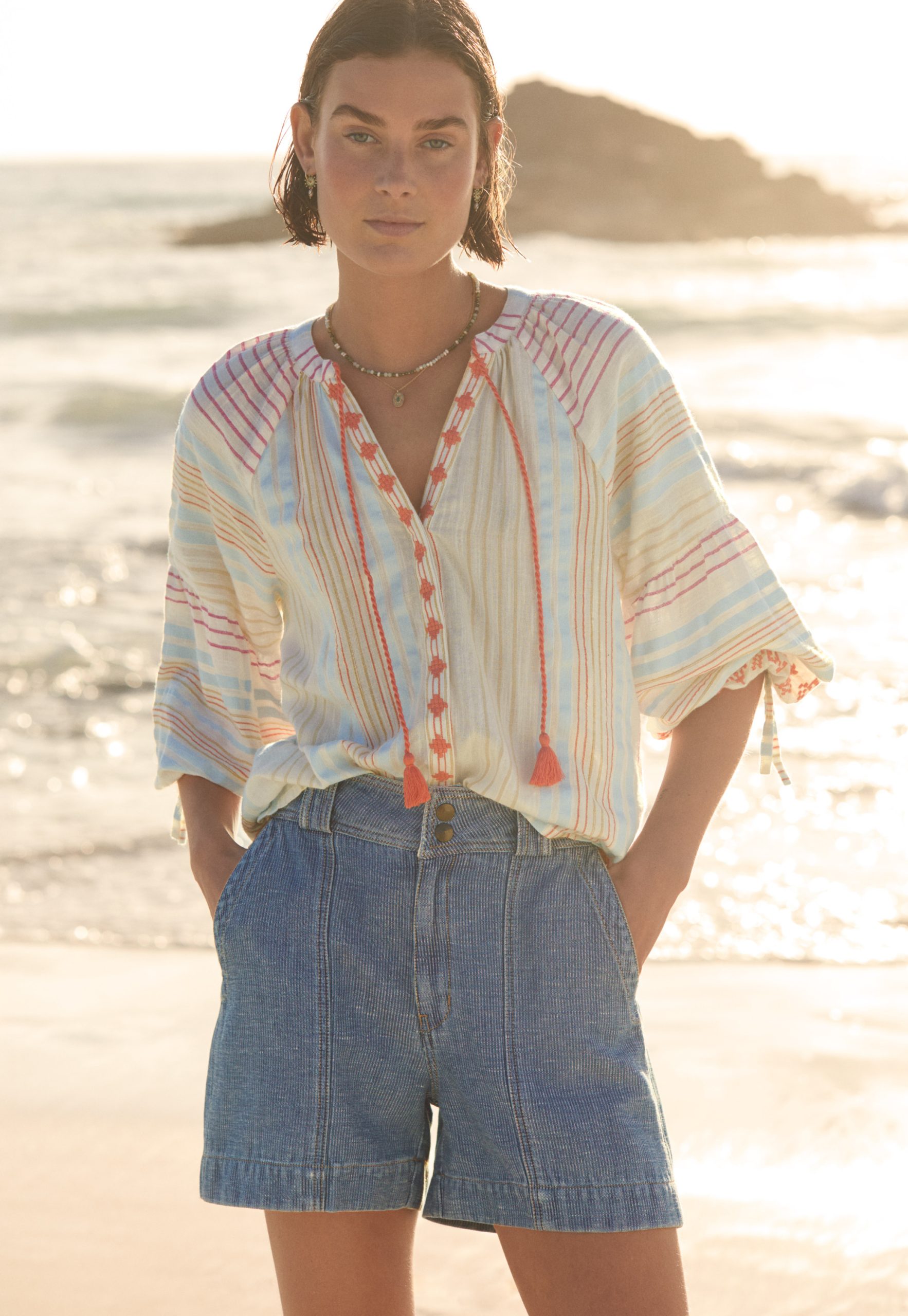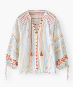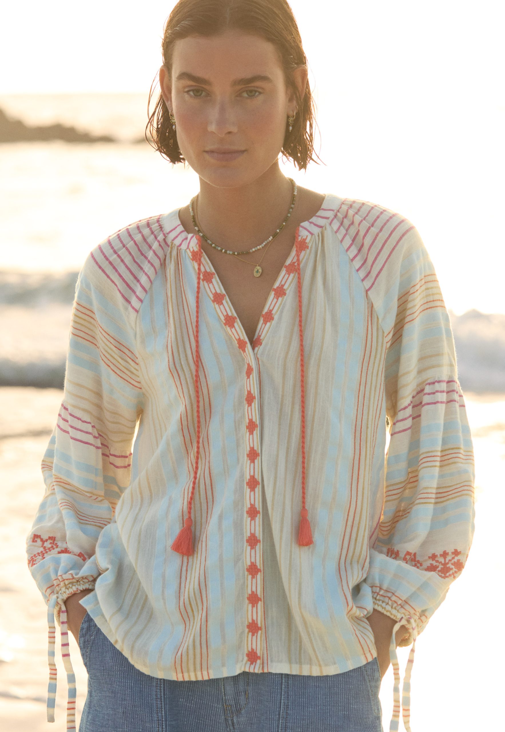 In colours as fresh as a summer’s morning, this striped lightweight cotton slub blouse is an uplifting addition to denim or linen trousers. Embroidery details cover the three-quarter length sleeves and run down the hidden button fastening. Tied with a tactile tassel at the neckline.