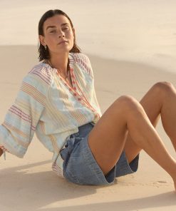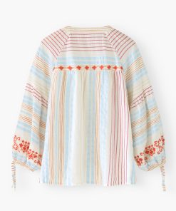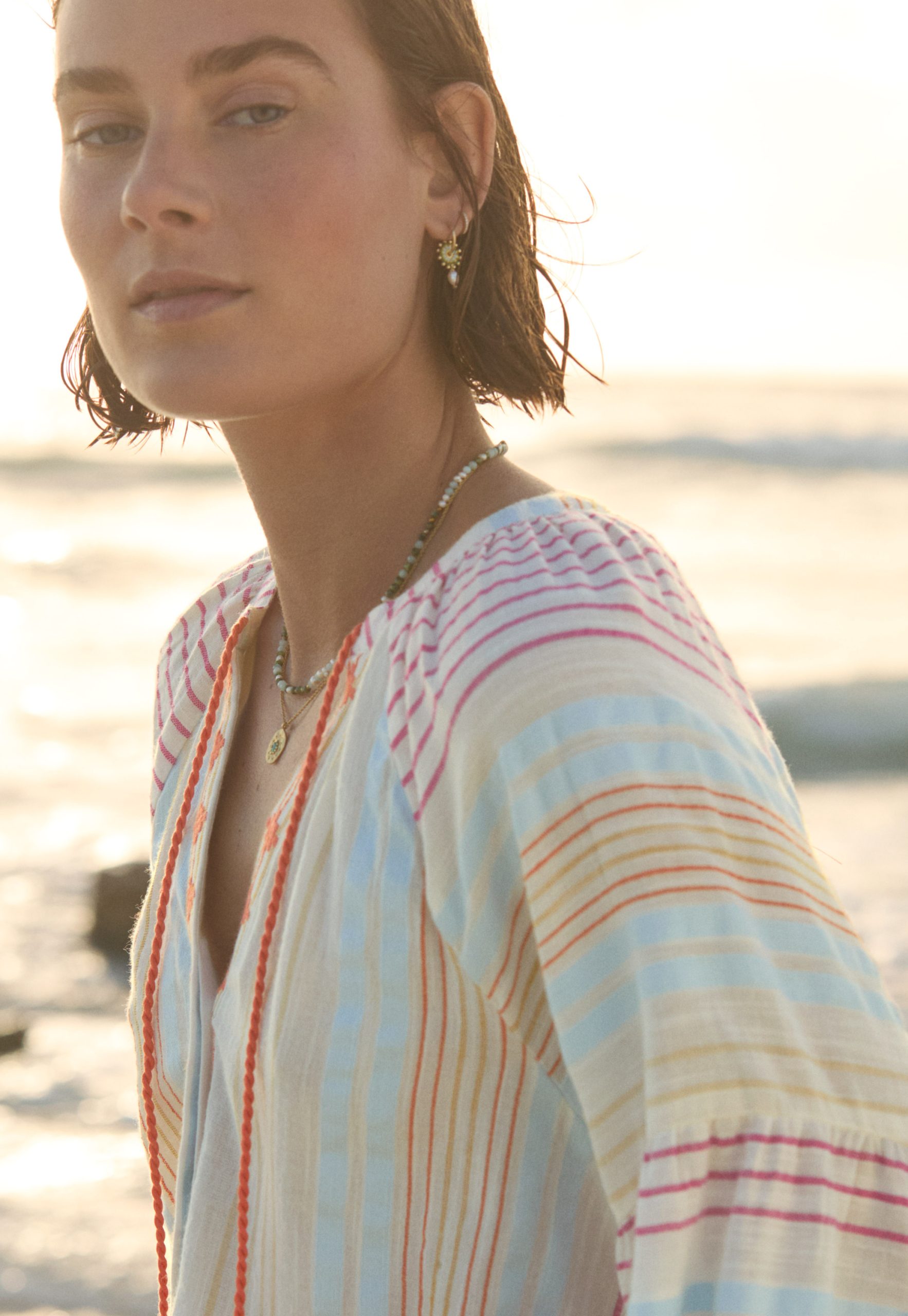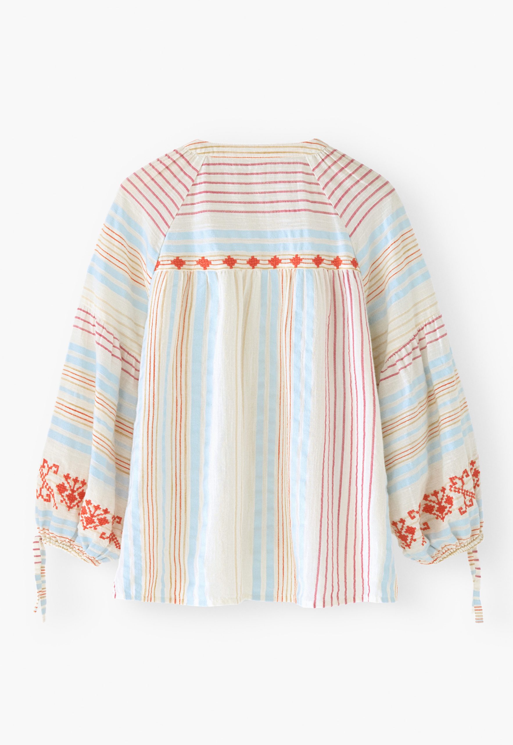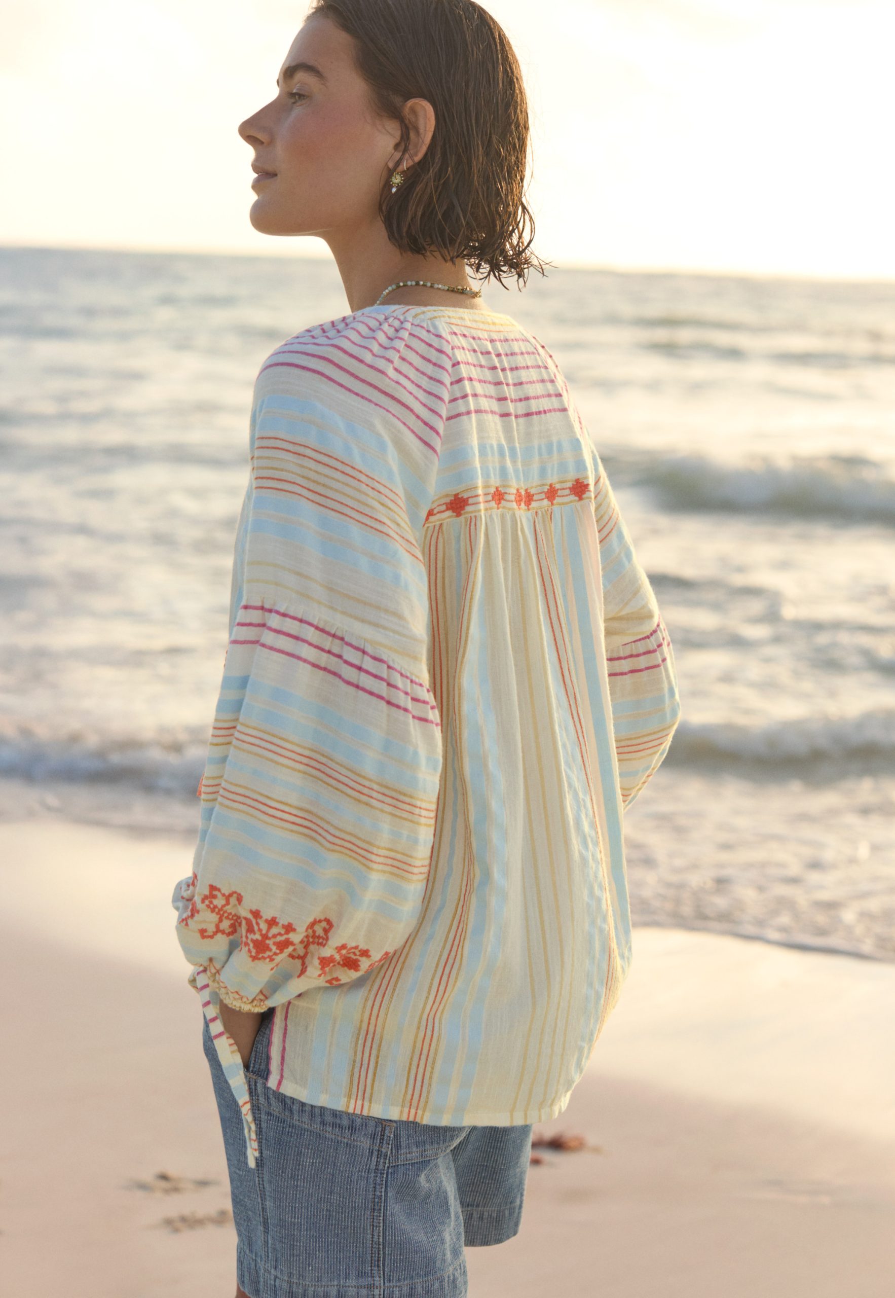 In colours as fresh as a summer’s morning, this striped lightweight cotton slub blouse is an uplifting addition to denim or linen trousers. Embroidery details cover the three-quarter length sleeves and run down the hidden button fastening. Tied with a tactile tassel at the neckline.