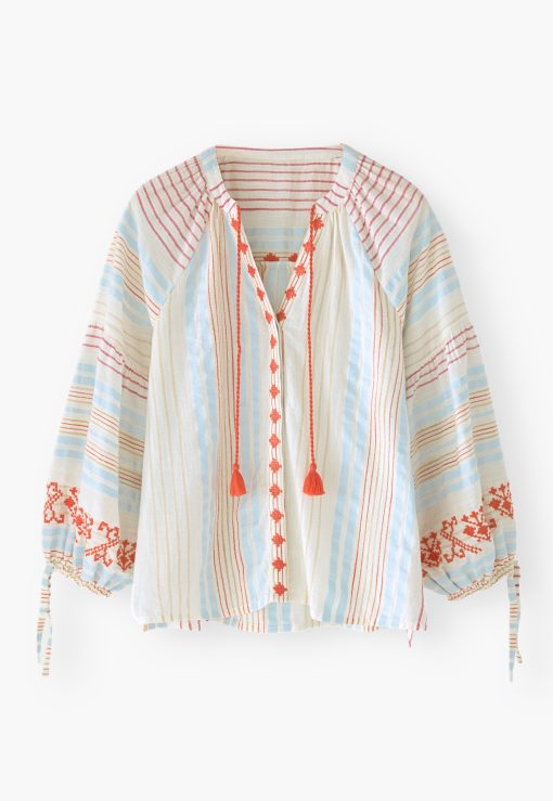 In colours as fresh as a summer’s morning, this striped lightweight cotton slub blouse is an uplifting addition to denim or linen trousers. Embroidery details cover the three-quarter length sleeves and run down the hidden button fastening. Tied with a tactile tassel at the neckline.