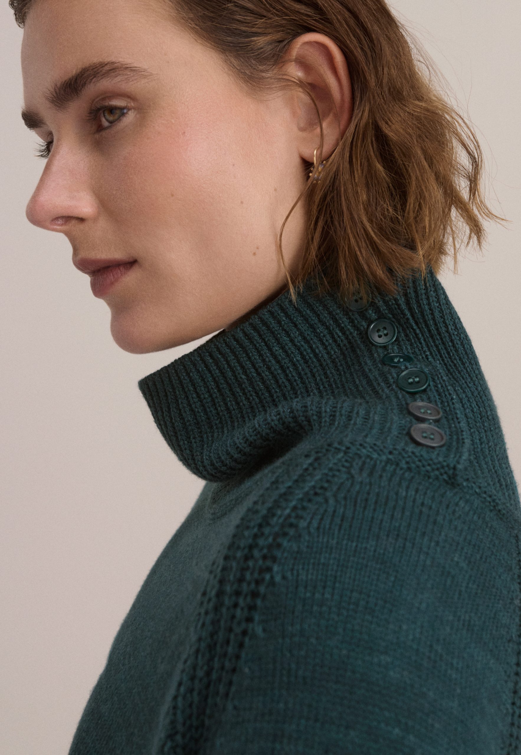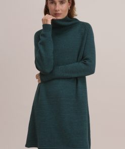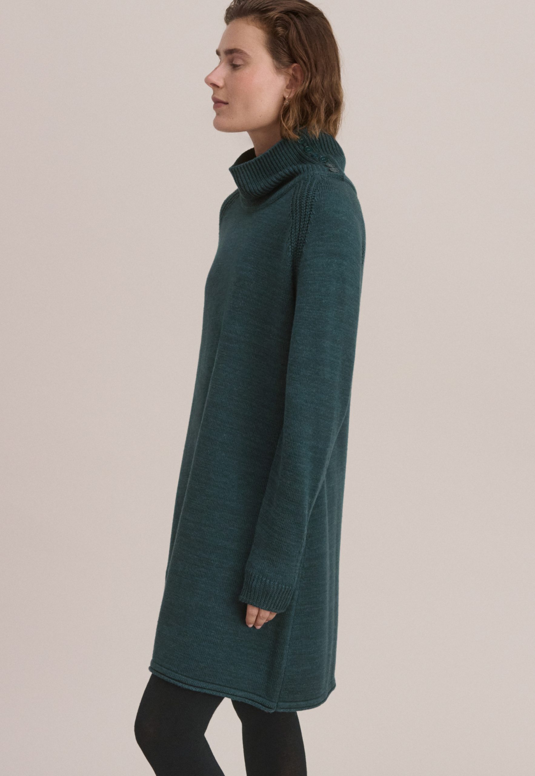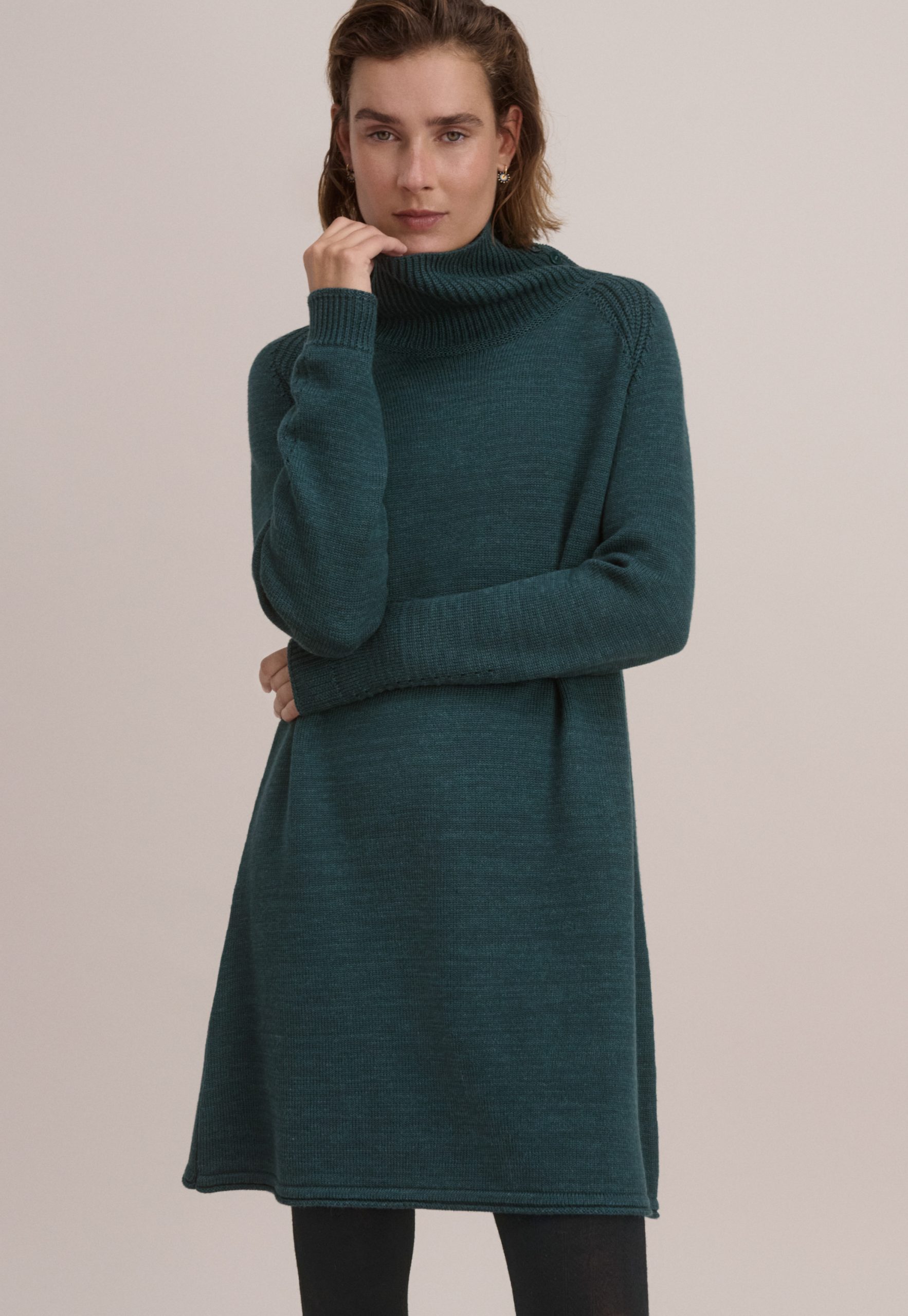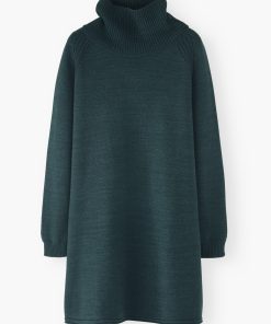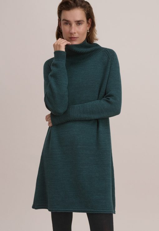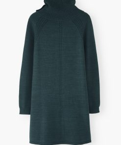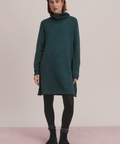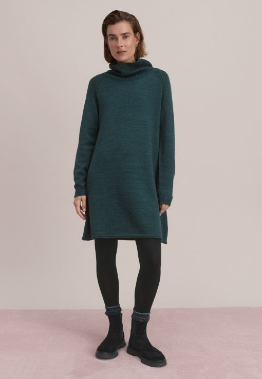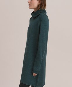 A dress that works brilliantly for weekends, this merino wool and organic cotton knit has a relaxed fit for all day comfort. Button-up the funnel-neck or add a belt to switch it up.