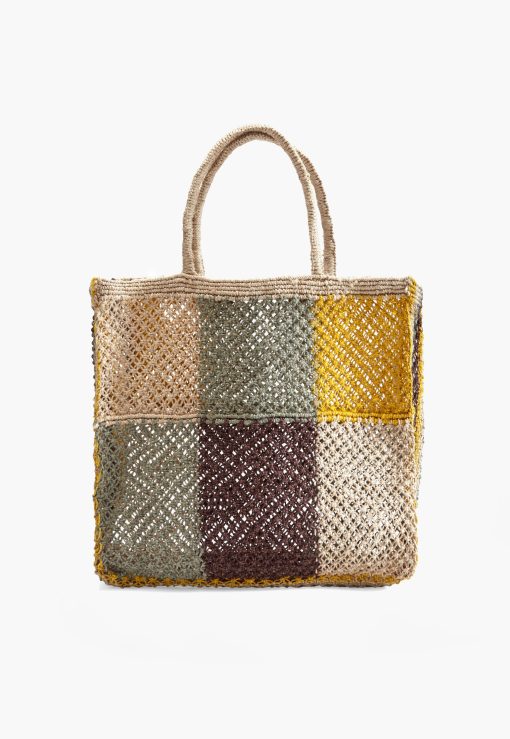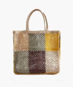 Fabulous patchwork tote woven from hardwearing jute by women artisans in Bangladesh. Slip the handles over your shoulders or carry by hand. Makes a great beach bag too.