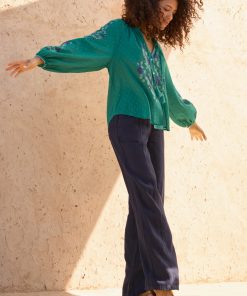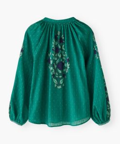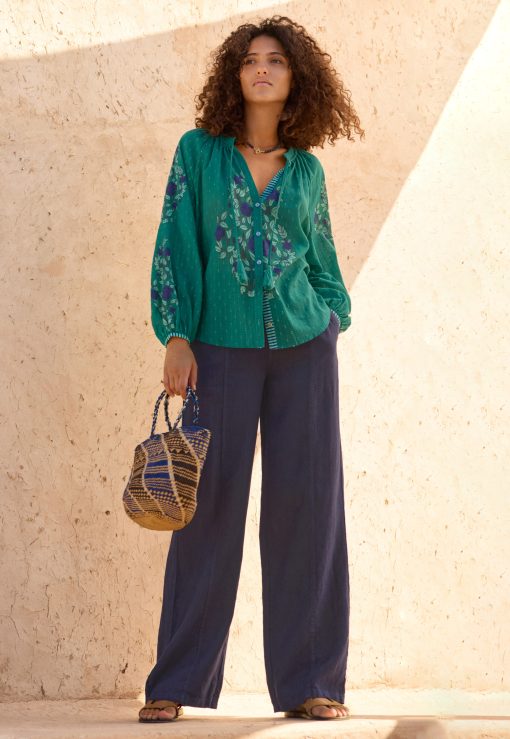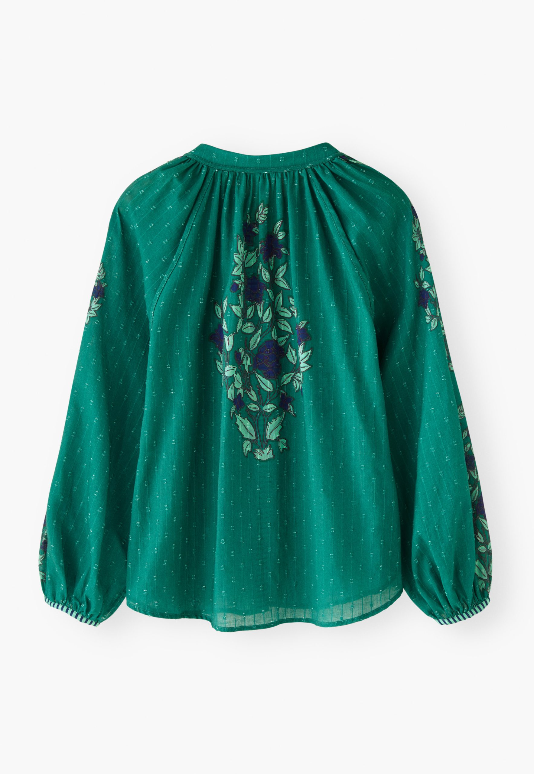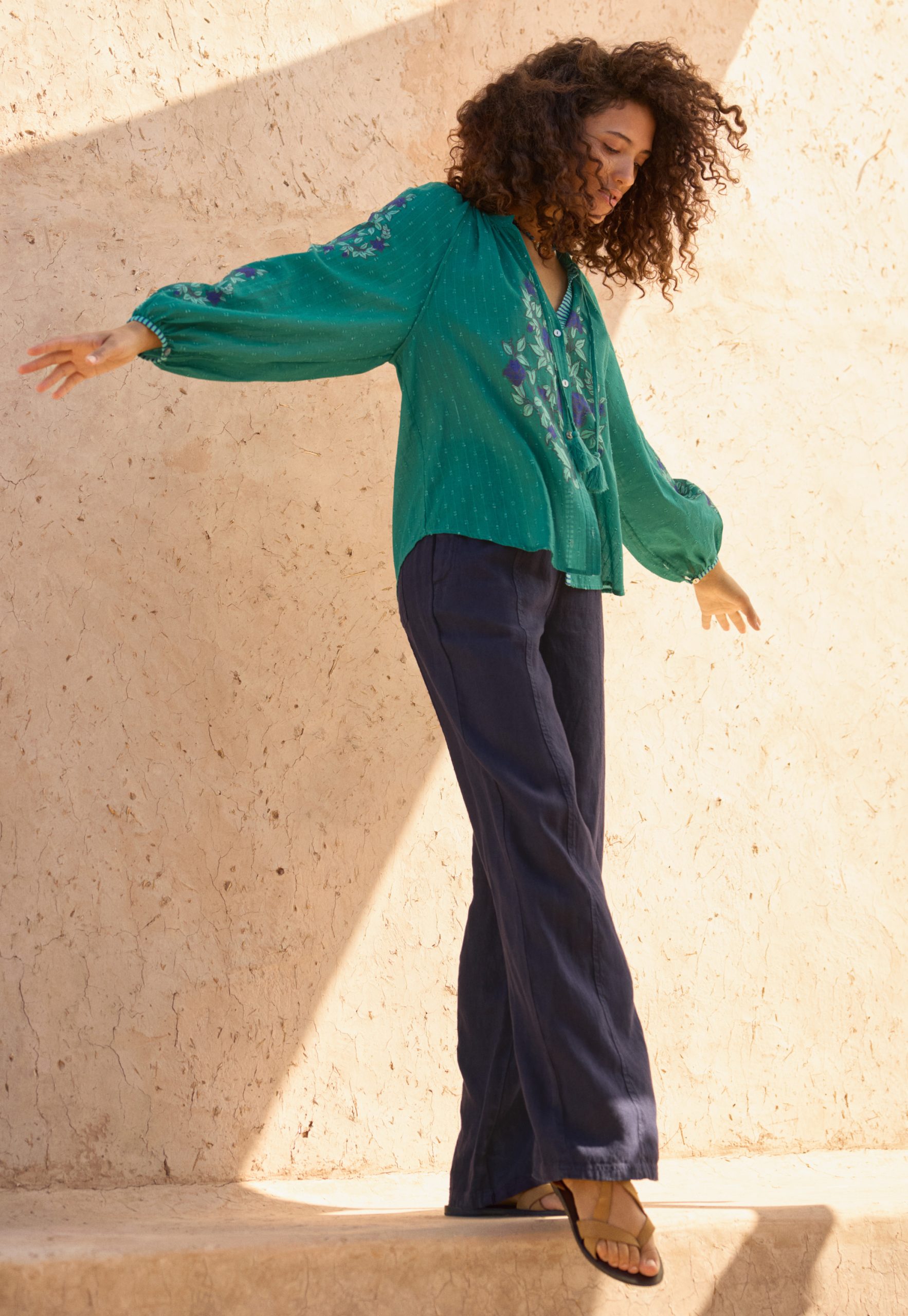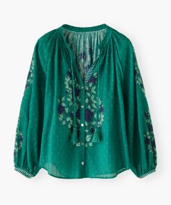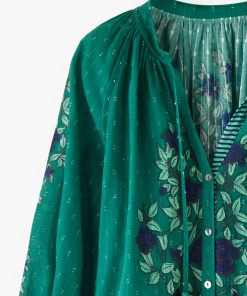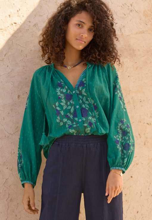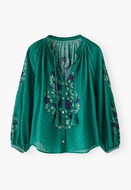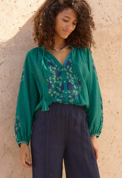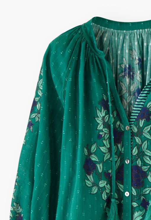 Taking care of every detail, we bring you a magnificent blouse in lightweight Swiss-dot cotton, with a lovely exclusive Wrap London botanical print. It also has contrasting stripes at the neckline and cuffs and two tactile tassels at the ends of the long fabric ties.